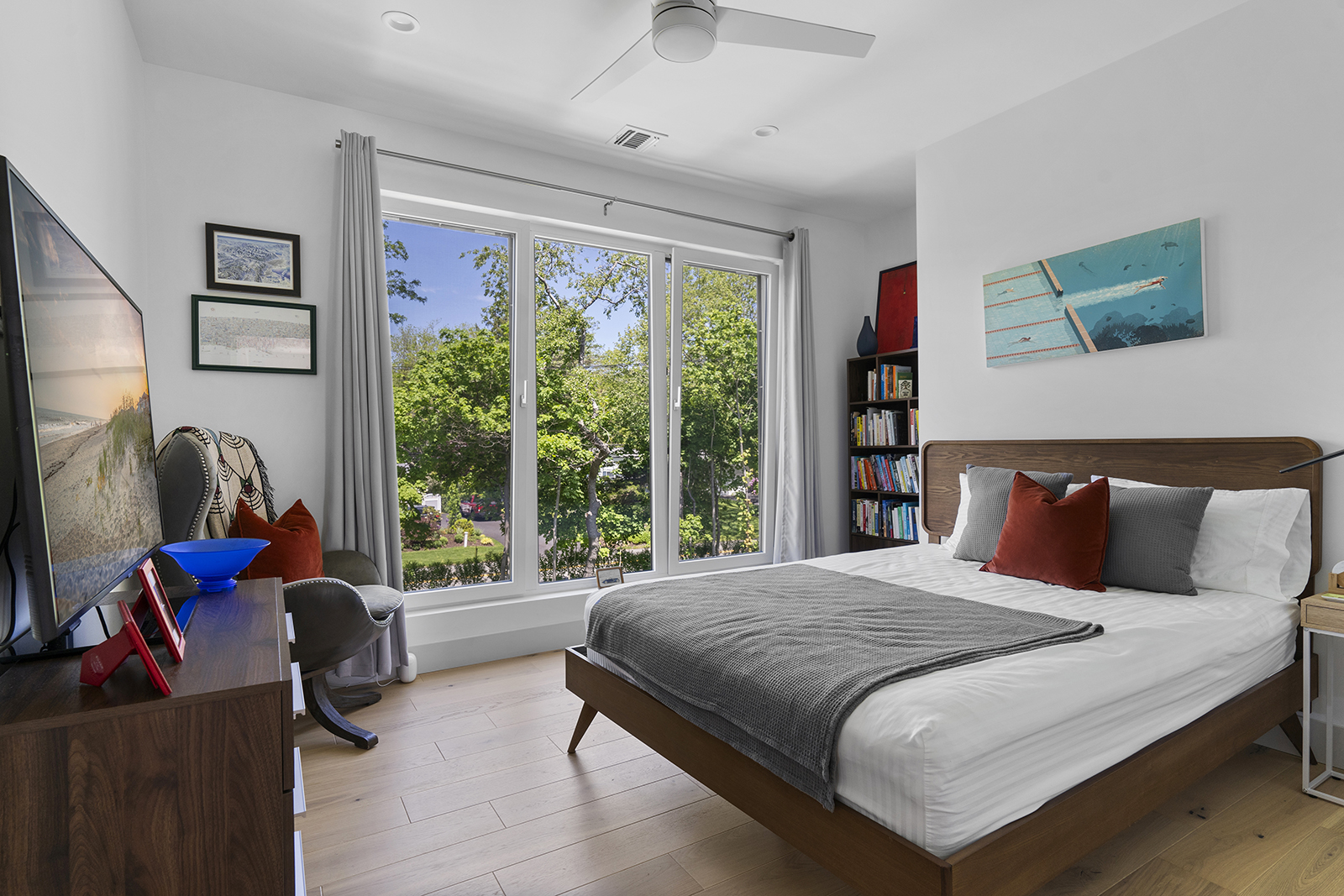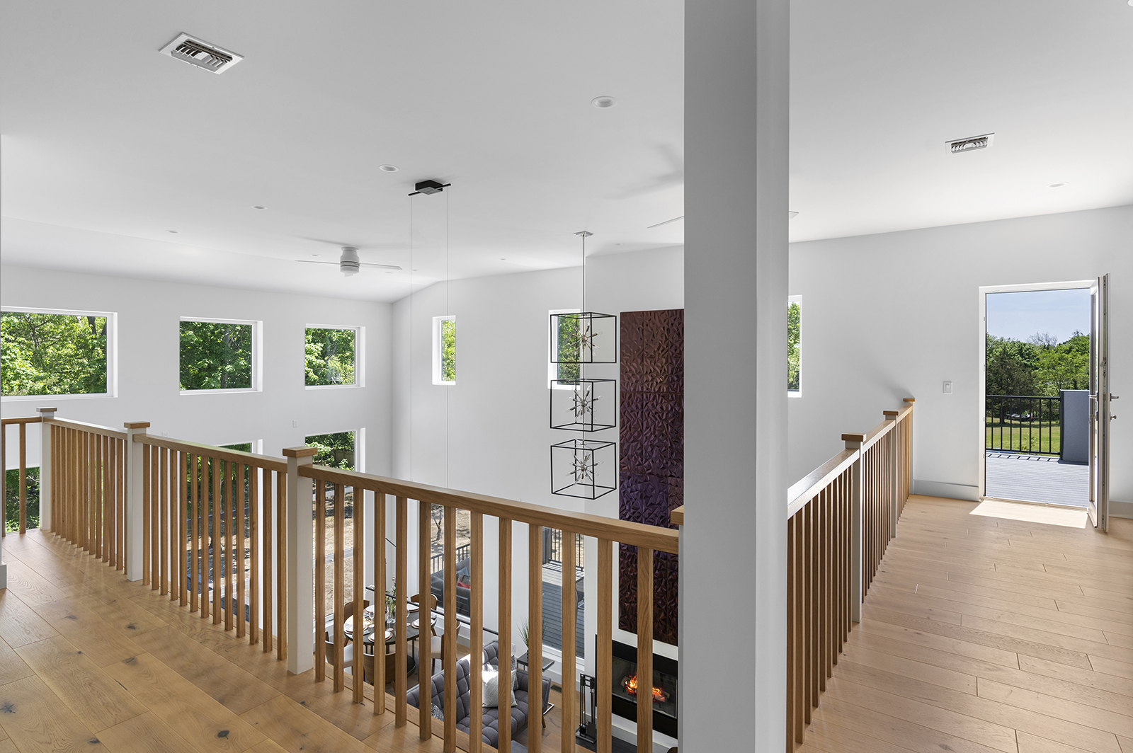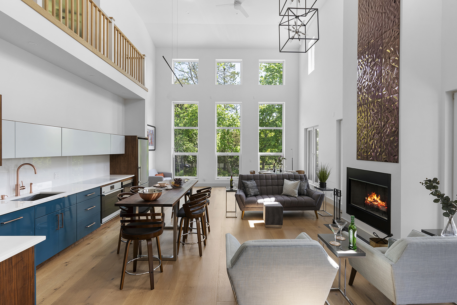 The striking, cool architecture harbors a super comfortable home boasting five bedrooms, three full baths and two half baths with enclosed glass showers, four expansive decks, a full basement illuminated by nine-foot ceilings for ample natural light, and a two-car garage equipped with a 16-foot wide electric door. There are two driveways and two chargers for electric vehicles, one inside the garage and the other next to the guest parking space. The dramatic double-height living room has a wood-burning fireplace, 20' ceilings, super tall European "tilt and turn" windows, and features 10" wide plank oak floors and a cool open oak wood staircase leading up to the galleria with access to the bedrooms. The home features a custom-designed kitchen with an open layout, quartz countertops, and high-quality modern appliances. There is an additional family room that has a gas-burning fireplace and offers a fully equipped wet bar with a large refrigerator/freezer, a dishwasher, and a built-in microwave.