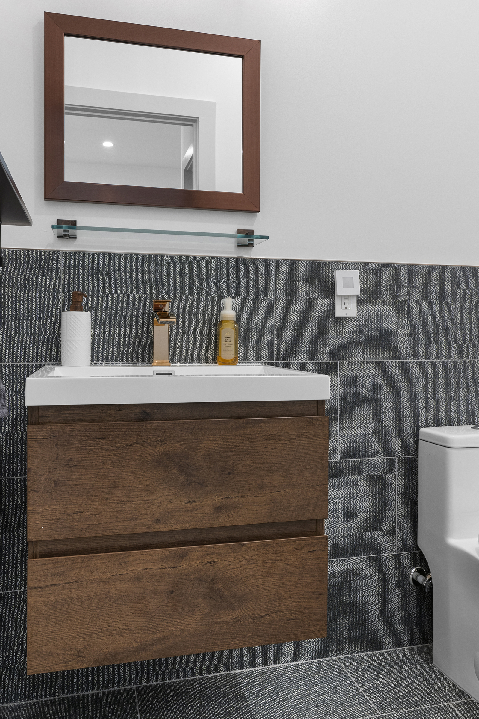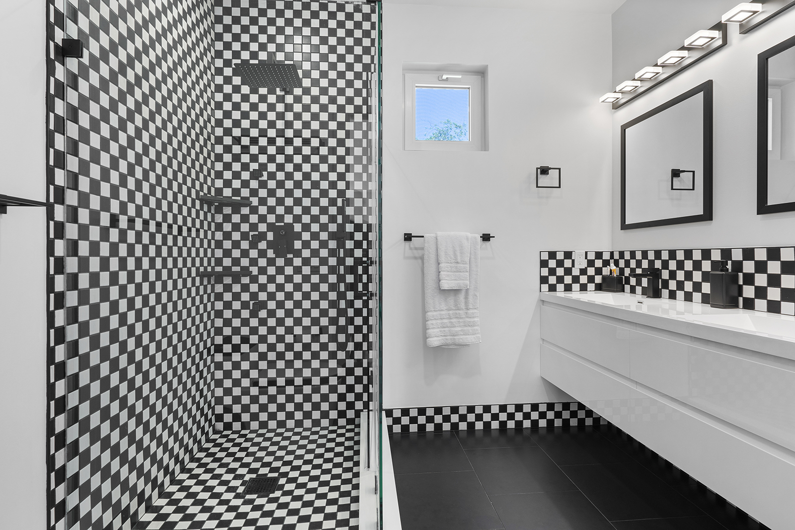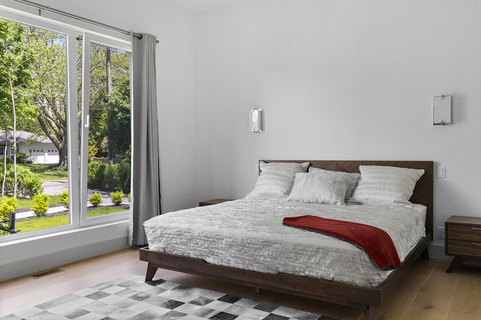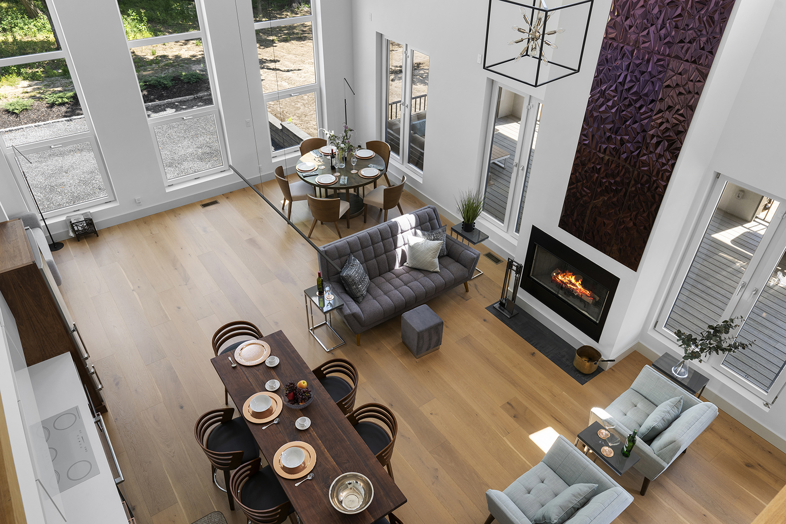 The striking, cool architecture harbors a super comfortable home boasting five bedrooms, three full baths and two half baths with enclosed glass showers, four expansive decks, a full basement illuminated by nine-foot ceilings for ample natural light, and a two-car garage equipped with a 16-foot wide electric door. There are two driveways and two chargers for electric vehicles, one inside the garage and the other next to the guest parking space. The dramatic double-height living room has a wood-burning fireplace, 20' ceilings, super tall European "tilt and turn" windows, and features 10" wide plank oak floors and a cool open oak wood staircase leading up to the galleria with access to the bedrooms. The home features a custom-designed kitchen with an open layout, quartz countertops, and high-quality modern appliances. There is an additional family room that has a gas-burning fireplace and offers a fully equipped wet bar with a large refrigerator/freezer, a dishwasher, and a built-in microwave.