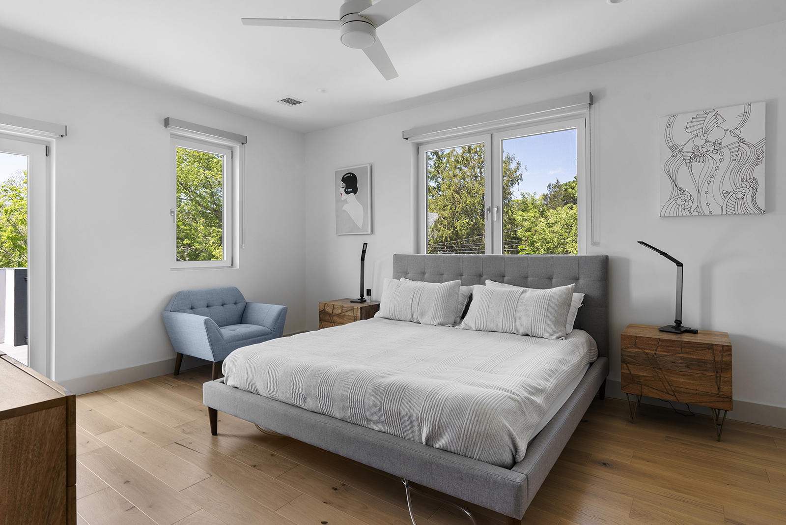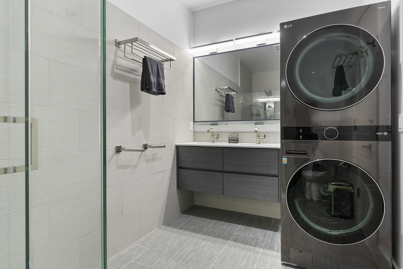 The central AC system has four zones that allow the residents to adjust the settings in their space of the house. Quiet ceiling fans are installed in every room and over the two lower decks. There are two sets of full-size washers/dryers, one in the basement and one on the second floor, for your convenience. A camera-aided security system is in place. The layout is designed to foster unity while also offering private spaces for independent activities or relaxation. There are nine custom closets. The upper deck offers a beautiful vista towards the bay with plenty of open skies. The house is additionally insulated all around the outside walls for energy efficiency and clad with a slick, modern version of stucco. This sophisticated house stands on a 0.69-acre landscaped lot with an automated irrigation system and also offers plenty of space to install a swimming pool.